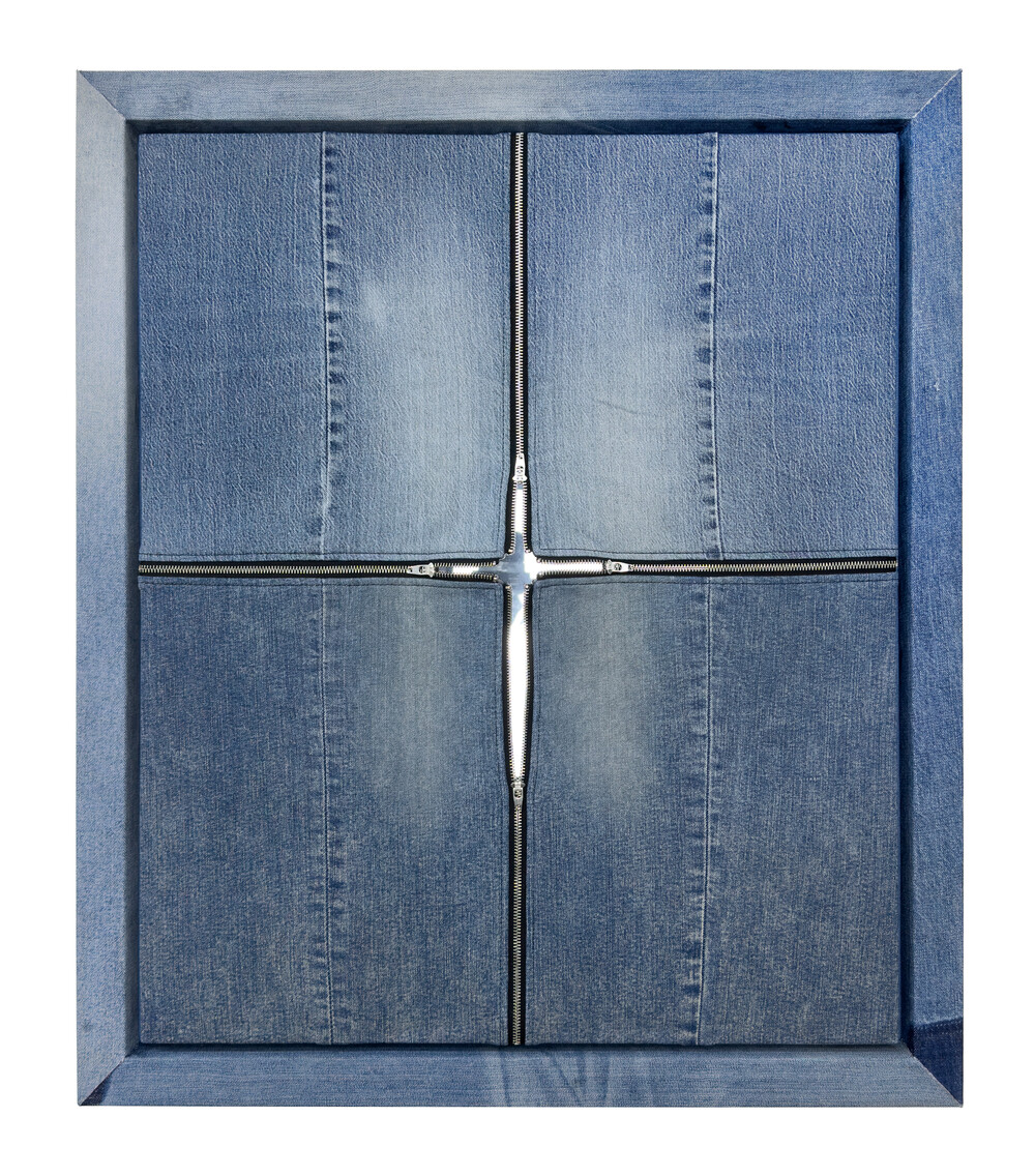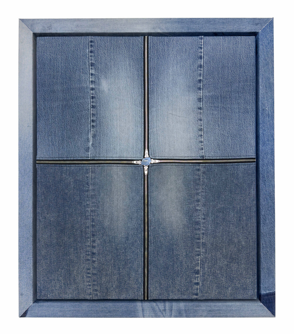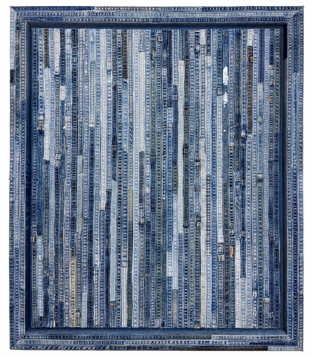 - 82.7 x 70.6cm, Used denim pants, Demim-covered frame