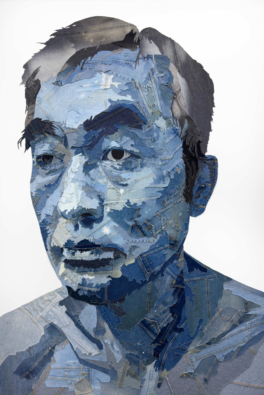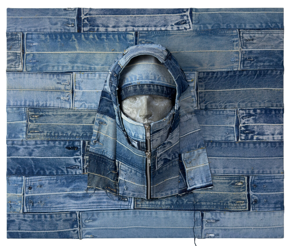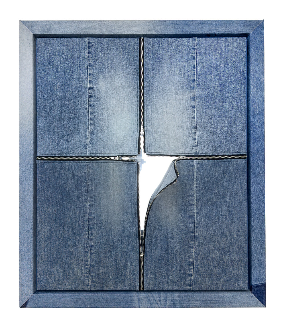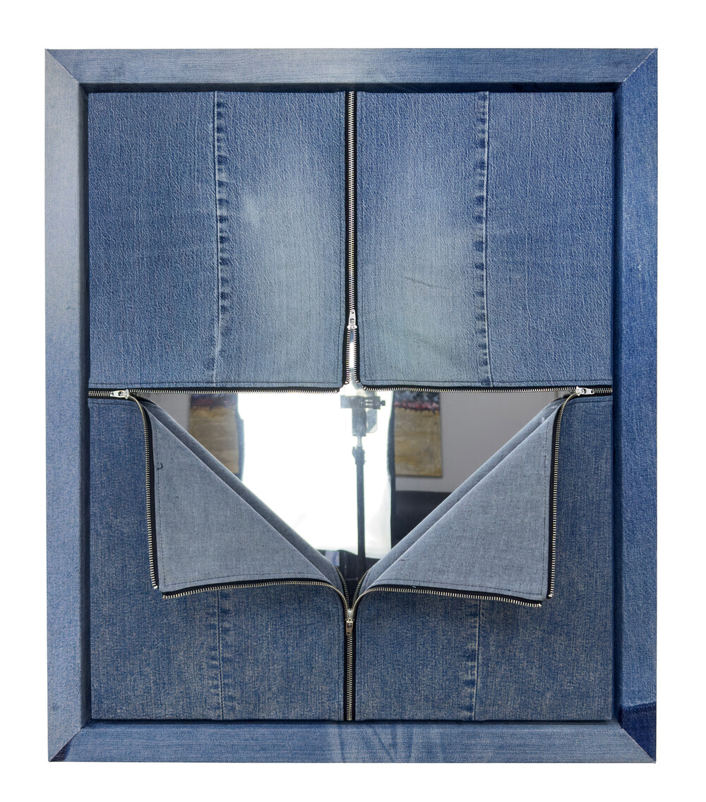 - 82.7 x 70.6cm, Used denim pants, Demim-covered frame