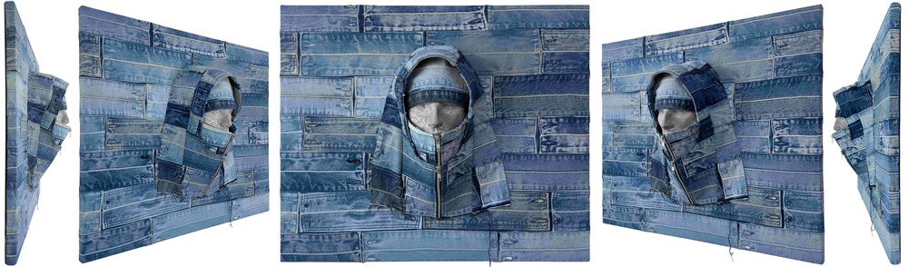 - FRP, used denim jackets and pants, wooden panel (100 x 80 cm), canvas (100 x 80 cm) (corner installation)